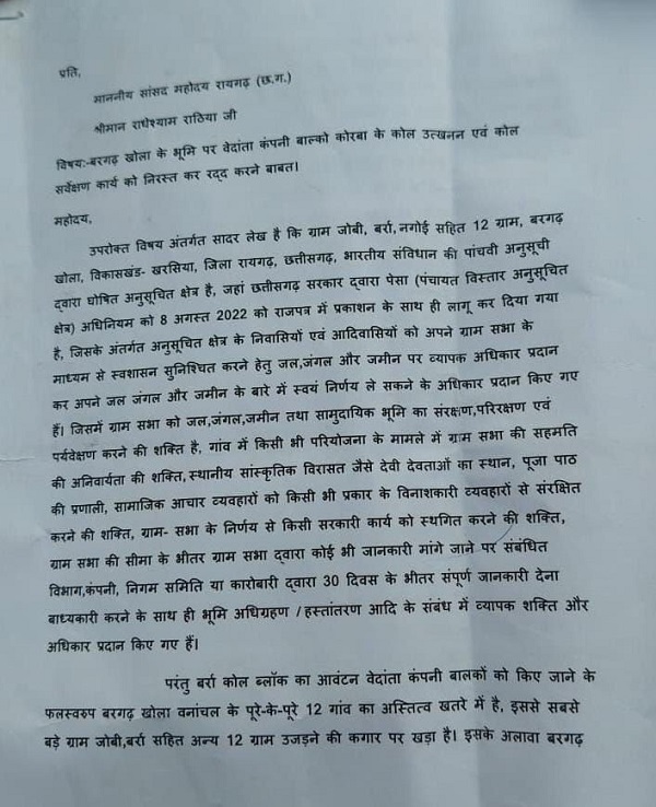 रायगढ़ में वेदांता के कोल प्रोजेक्ट का विरोध, आदिवासियों ने सांसद राधेश्याम को सौंपा… – भारत संपर्क न्यूज़ …